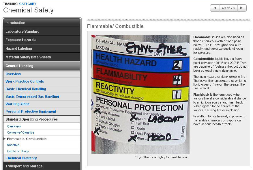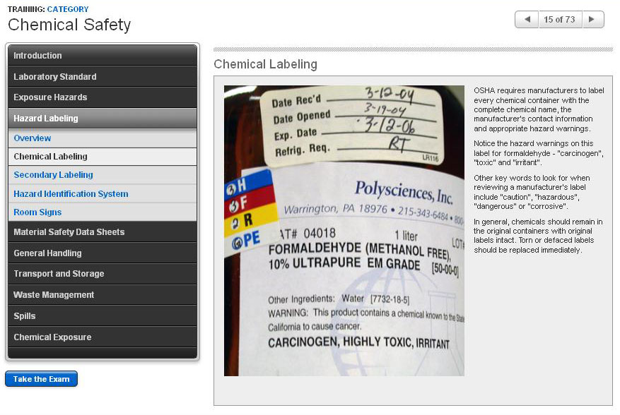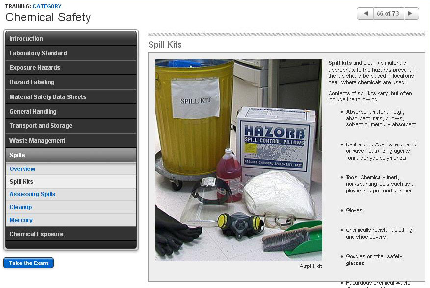 Proper handling, storage, and disposal of laboratory chemicals, and methods for responding to chemical spills and exposure.
