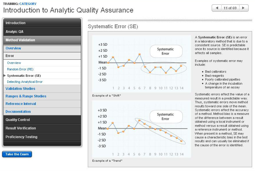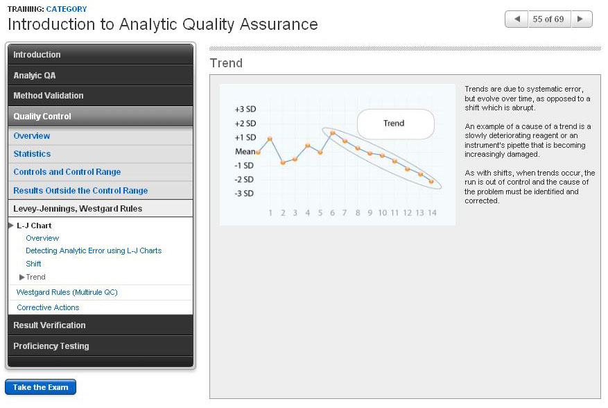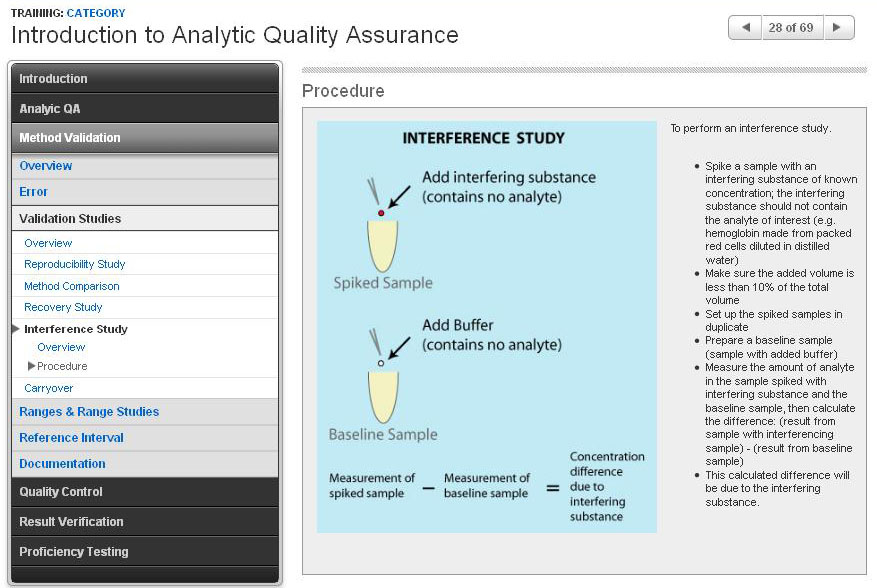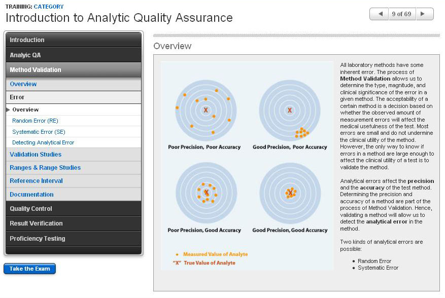 An introduction to analytic quality assurance, quality control, and related topics, including statistical formulas, method validation studies, analytical error, Levey-Jennings interpretation, result verification, and proficiency testing.
