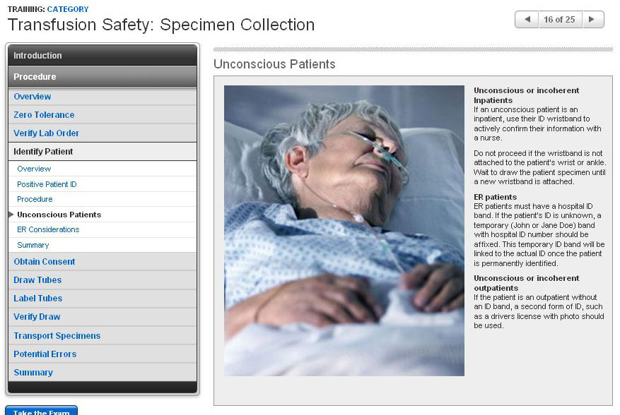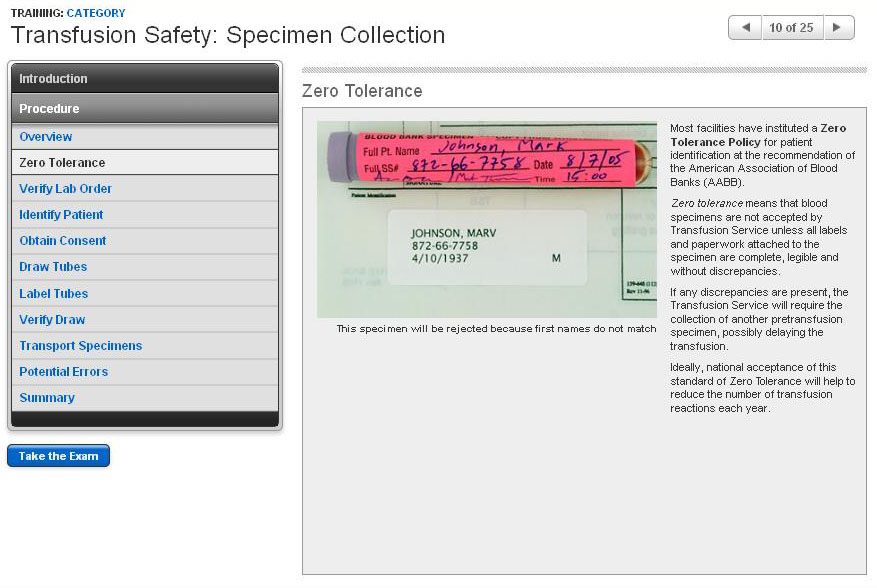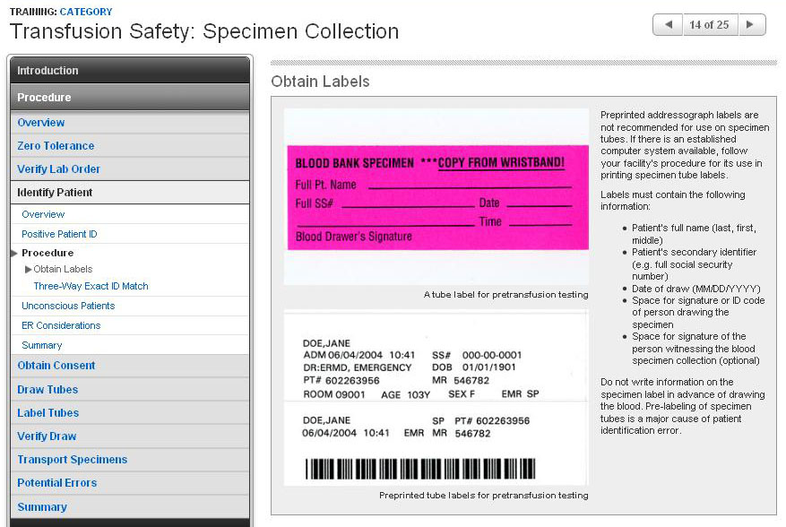 Patient safety in the collection of pre-transfusion specimens. Topics include: patient identification procedure, tube labeling, and identifying and resolving discrepancies.