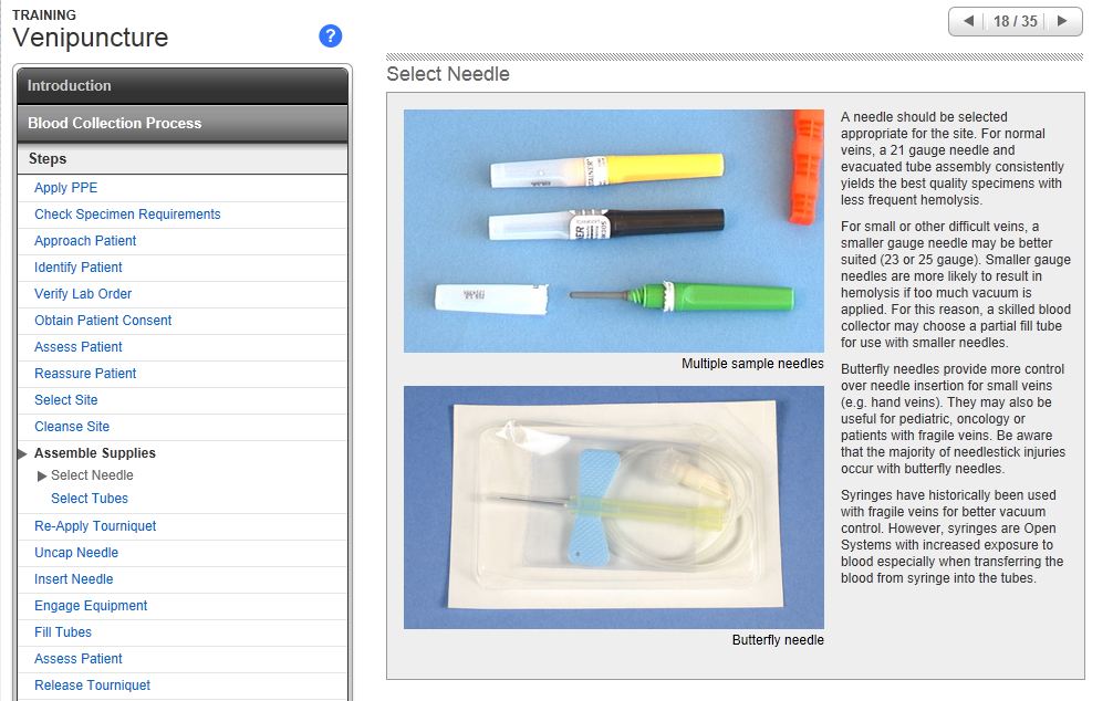 - Describe how to select venipuncture equipment.